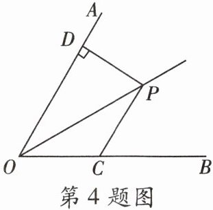 4. 如图,点 P 是∠AOB 的平分线上一点,过点 P 作 PC//OA 交 OB 于点 C,PD⊥OA 于点 D。若 OC = 5,PD = 4,则 OP = ______