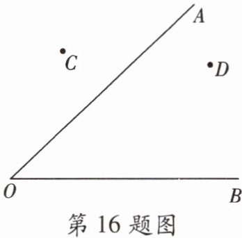 16. (8 分) 如图,校园有两条路 OA、OB,在交叉路口附近有两块宣传牌 C、D,学校准备在这里安装一盏路灯,要求灯柱的位置 P 离两块宣传牌一样远,并且到两条路的距离也一样远,请你帮助画出灯柱的位置 P,简要说明理由。