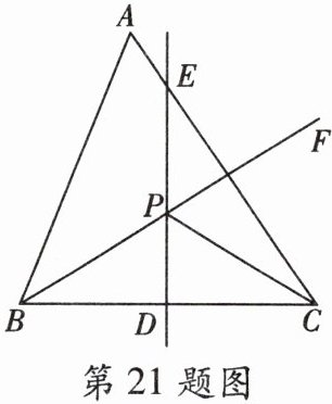 21. (12 分) 如图,在△ABC 中,∠A = 60°,点 D 是 BC 边的中点,DE⊥BC,∠ABC 的平分线 BF 交 DE 于△ABC 内一点 P,连接 PC。
