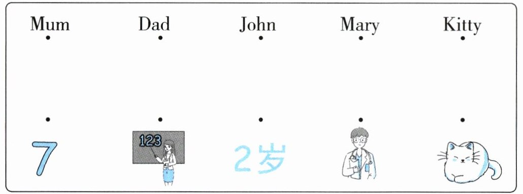 My name is Mary. I'm a girl. This is a picture of my family. Look! This is my mum. She is a Maths teacher. The tall man next to my mum is my dad. He is a doctor. This is John, my little brother. He is only 2. But I'm 5 years older than(岁数比……大) John. We live with my grandpa. And this is Kitty, our cute cat.