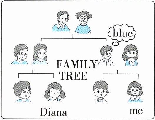 1. blue 2. sister 3. two/2 4. cousin