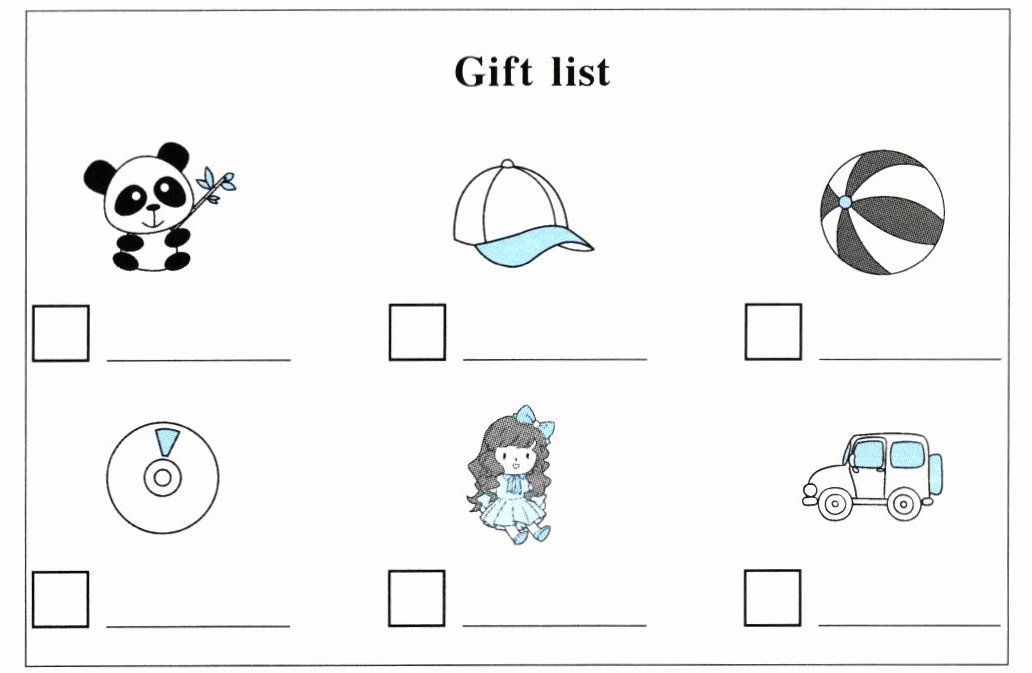 五 听录音,在方框中勾选“√”朋友们为 Mike 准备的生日礼物,并在横线上写出这些礼物是谁送的。(写序号)(听三遍,8 分)