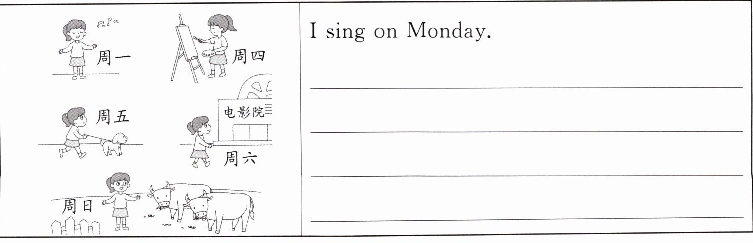I draw pictures on Thursday. I walk my dog on Friday. I go to the cinema on Saturday. I go to the farm on Sunday.
