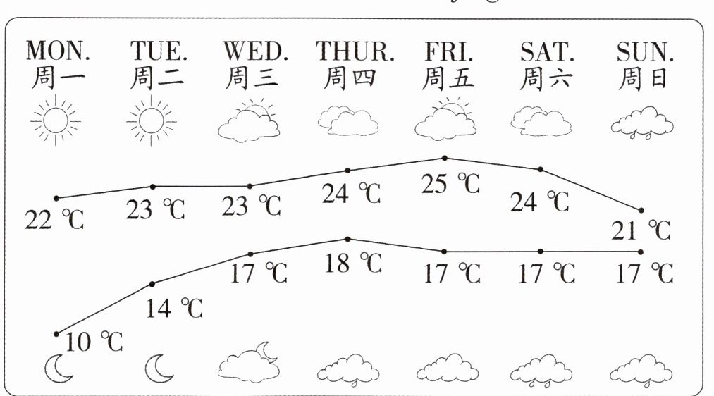 ( )3. The highest temperature(最高温度) is 25℃ on Friday.