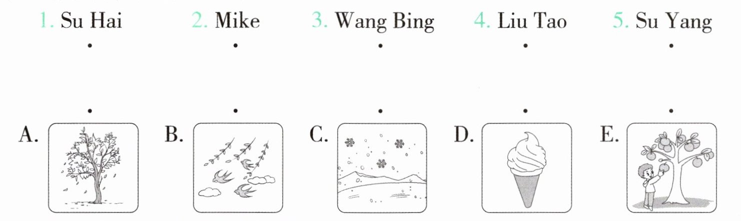 1. go skating 2. in spring 3. play in the snow 4. eat ice cream 5. go swimming 6. four seasons