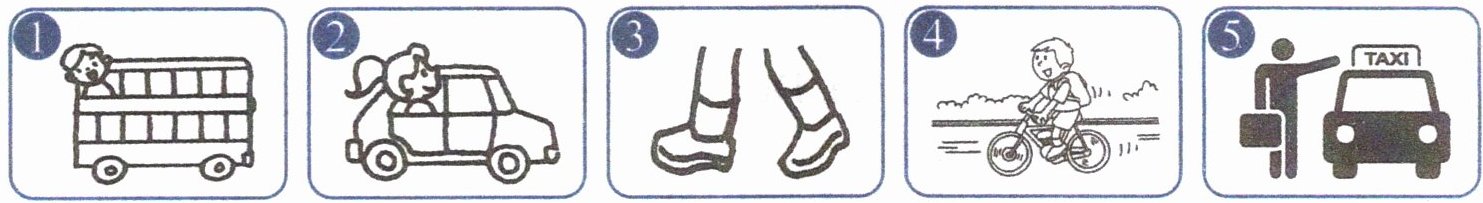 1. by bus 2. by car 3. on foot 4. by bike 5. by taxi