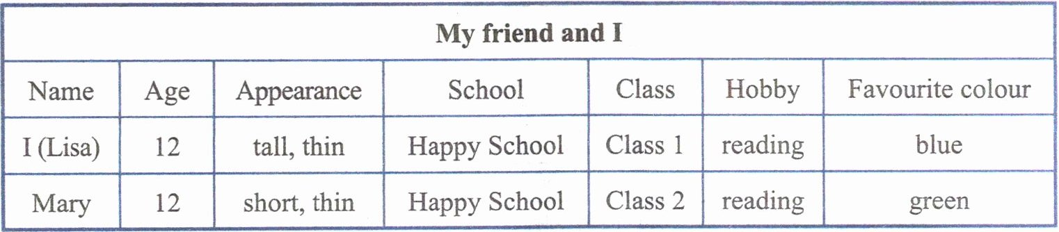 I'm Lisa. Mary is my friend. We are both 12 years old. We are both thin. We are in the same school, but we are in different classes. We both like reading. We like different colours. I like blue. Mary likes green.