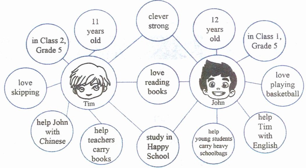 参考范文: Tim and John are good friends. Tim is 11 years old and John is 12 years old. They are both clever and strong. They both love reading books. They both study in Happy School. They are in different classes. Tim is Class 2, Grade 5 and John is in Class 1, Grade 5. They both love sport. Tim loves skipping and John loves playing basketball. They both like helping people. Tim often helps teachers carry heavy books. John often helps young students carry heavy schoolbags. They help each other. Tim helps John with Chinese. And John helps Tim with English. They are really good friends.