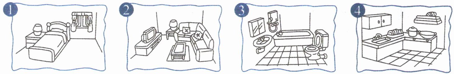 1. bedroom 2. living room 3. bathroom 4. kitchen