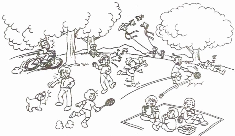 It's Sunday today. The children are at a park. They are having a good time. A boy is riding a bike. Two boys are under the tree. One is reading a book. The other is sleeping. Two boys are flying kites. A boy is singing and a girl is dancing. Two boys are playing badminton. Three boys are eating and drinking. A boy is pointing to a dog. The dog is barking at him.