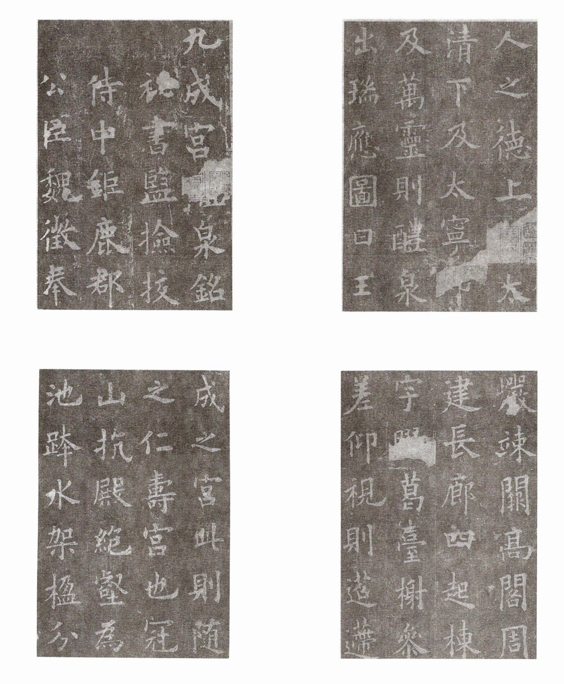 《九成宫醴泉铭》是欧阳询七十五岁时的作品,最能代表其书法水平,充分体现了欧阳询书法结构严谨、圆润秀劲的特点。唐贞观五年(631),唐太宗在九成宫避暑时发现醴泉,太宗大喜,认为是祥瑞之兆,遂命魏徵撰文,欧阳询书写,匠工刻碑,即成《九成宫醴泉铭》。此碑笔法融清秀婉润与刚劲端庄于一体,历来为学书者推崇,是人们临习楷书的范本。