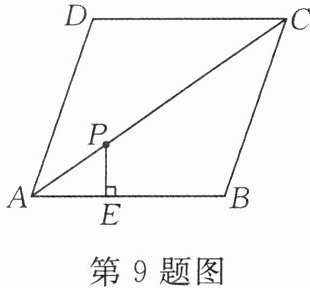 9. (★★★☆☆)如图,在菱形ABCD中,点P是对角线AC上的一点,PE⊥AB于点E,若PE= 3,则点P到AD的距离为______