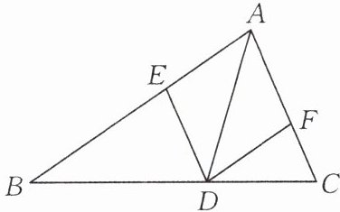 (1) 证明:$ \because DE // AC $,$ DF // AB $,$ \therefore $ 四边形 AEDF 是平行四边形,$ \therefore AE = DF $;