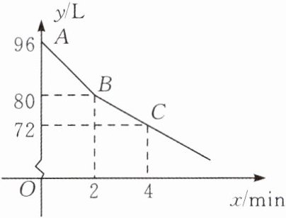 4. 某校部分住校生放学后到学校锅炉房打水,每人接水2L,他们先同时打开两个水龙头,后来因故障关闭一个水龙头.假设前后两人接水间隔时间忽略不计,且不发生泼洒,锅炉内的余水量y(单位:L)与接水时间x(单位:min)的函数图象如图所示.