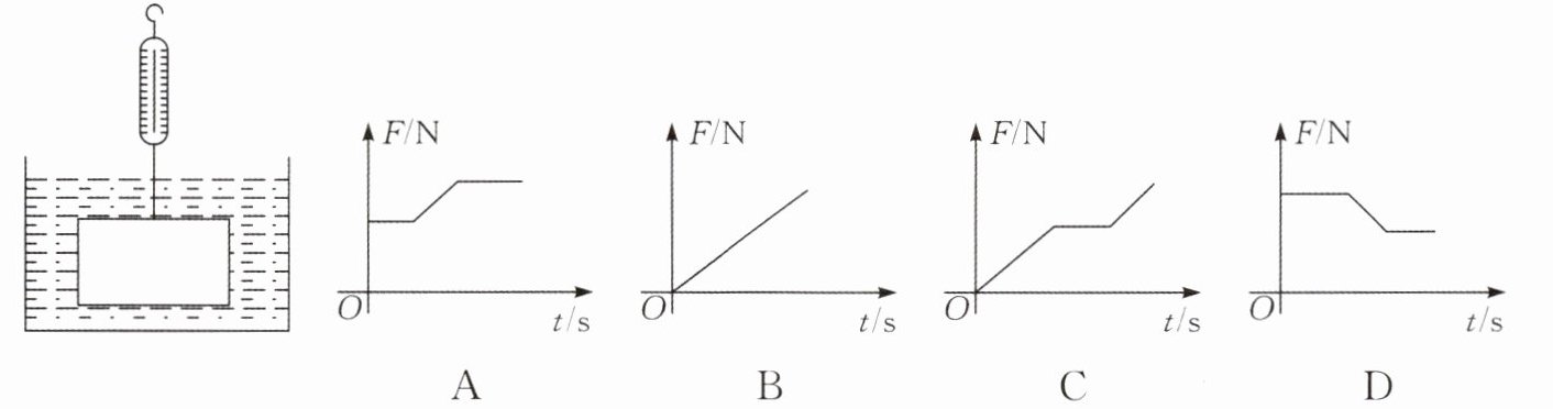 2. (★★☆☆☆)如图,挂在弹簧测力计上的长方体铁块浸没在水中,提着弹簧测力计匀速上移,直至铁块浮出水面停留在空中(不计空气的阻力),弹簧测力计的读数F(单位:N)与时间t(单位:s)的函数图象大致是(