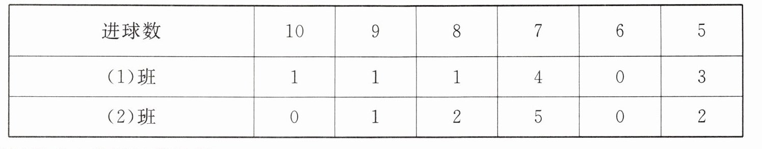 8. (★★★☆☆)八年级(1)班和(2)班各推选10名同学进行投篮比赛,按照比赛规则,每人各投了10个球,两个班选手的进球数统计如下表: