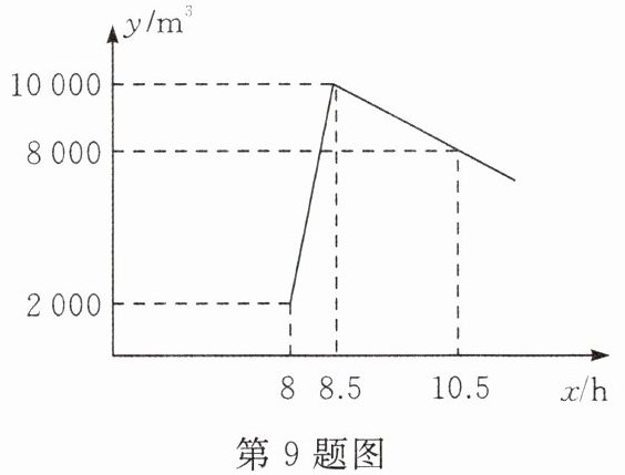 9. (★★☆☆☆)星期天上午$8:00\sim 8:30$,燃气公司给平安加气站的储气罐注入天然气.注完气之后,一位工作人员以每车$20m^{3}$的加气量,依次给在加气站排队等候的若干辆车加气.储气罐中的储气量y(单位:$m^{3}$)与时间x(单位:h)的函数关系如图所示.