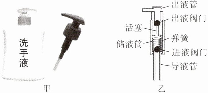 8. (★★★★☆)如图甲所示,洗手液瓶中有个按压式吸液结构,它由图乙的结构组成。使用的时候,手向下按压,活塞向下移动,弹簧被压缩,进液阀门关闭,出液阀门打开,储液筒里的液体从出液管流出瓶外;当手松开时,弹簧恢复原来的自然状态使得活塞向上移动,出液阀门关闭,进液阀门打开,液体从导液管通过进液阀门进入储液筒。活塞这样在圆筒中上下往复运动,不断地把液体“吸”出瓶外。