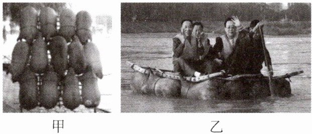 9.(★★★★☆)乘坐羊皮筏在水流湍急的黄河里漂流,是一项惊险的活动。羊皮筏是由多具充气的羊皮捆绑在支架上而做成的,如图甲所示。图甲中羊皮筏总重为500N,平均每具羊皮筏最多能排开水$0.05m^3。$图乙是游客乘坐在图甲所示羊皮筏上漂流的情景。设每人的平均体重为700N,求:(g取10N/kg,ρ_水$= 1.0×10^3kg/m^3)$