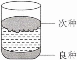 3. (★☆☆☆☆)选择优良种子,是农业丰收的基本保证。盐水选种是我国农民常采用的选种方法:将待选的种子放入浓度适当的盐水中,良种沉入水底,次种则漂浮于水面上,很快就能完成选种工作,如图所示。但盐水浓度的把握是关键,如果盐水的浓度太低,则可能(