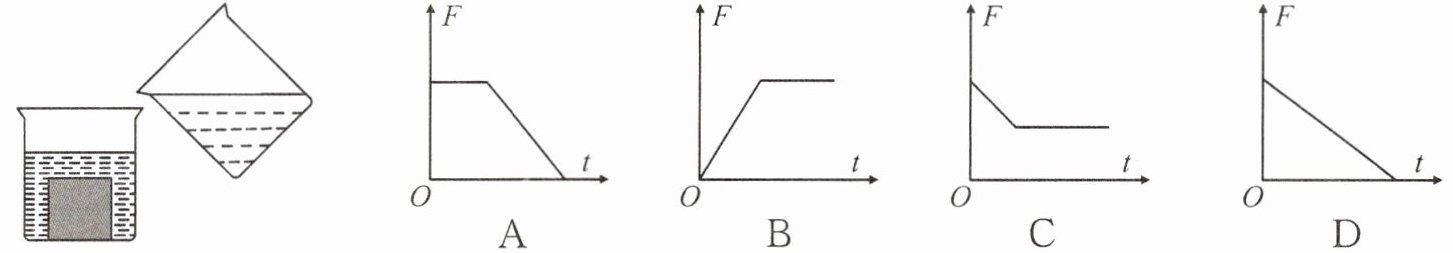 5. (★★☆☆☆)如图所示,把铁块放在容器中,沿容器壁缓慢向容器中加水至实线处,则在加水的全过程中,容器底对铁块的支持力F与时间t的关系图像为(