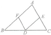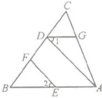 【解析】:因为 FD//AC,根据两直线平行,同旁内角互补,所以∠A 与∠AFD 是同旁内角,它们的和为 180°;∠C 与∠FDC 是同旁内角,它们的和为 180°。若∠BFD=∠FDE,∠BFD 和∠FDE 是内错角,根据内错角相等,两直线平行,可得出 BF//DE。