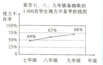 (2)从七、八、九年级各随机抽取了$1000$名学生进行调查,那么可认为调查了$1000 × 3=3000$(名)学生,从图中可知,七年级视力不良率为$49\%$,八年级视力不良率为$63\%$,九年级视力不良率为$68\%$,所以视力不良率为$\frac{1000 × 49\%+1000 × 63\%+1000 × 68\%}{3000} × 100\% \approx 60\%$。