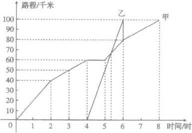 【解析】:通过观察甲、乙两人离开A城的路程与时间关系图象,可从出发时间、到达时间、行驶过程中的停留情况、相遇时刻以及速度快慢等方面获取信息。从横轴时间和纵轴路程的对应关系分析:甲的图象起点在原点,说明甲0时出发;乙的图象起点在时间4时,路程0千米处,即乙4时出发。甲到达B城(路程100千米)对应的时间是8时,乙到达对应的时间是6时。甲的图象在3 - 4小时段路程未变(从60千米保持),表明甲中途停留1小时。甲和乙的图象交点对应的时间是5小时,此时路程70千米,即5时两人相遇。乙从4时出发到6时到达,用时2小时行100千米,甲从0时到8时(扣除停留1小时实际行驶7小时)行100千米,显然乙速度比甲快。