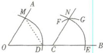 【解析】:要作$CN// OA$,根据尺规作一个角等于已知角的方法,需以点$O$为圆心,任意长为半径画弧,交$OA$于点$M$,交$OB$于点$D$;再以点$C$为圆心,$OM$(或$OD$)为半径画弧,交$OB$于点$E$;然后以点$E$为圆心,$DM$为半径画弧,交前弧于点$F$,过点$C$、$F$作射线$CN$,则$CN// OA$。观察作图痕迹,弧$FG$是以点$E$为圆心,$DM$为半径的弧。