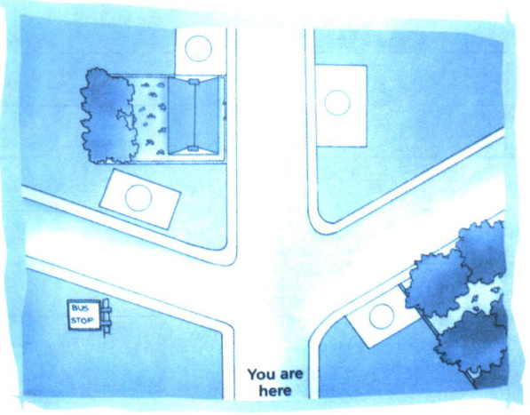 There is a church① opposite the bus stop. You go straight ahead, then you can see a police station② on your right. There is a school opposite the police station. And the post office③ is next to it. You go right, then you can see the museum④ on the right.