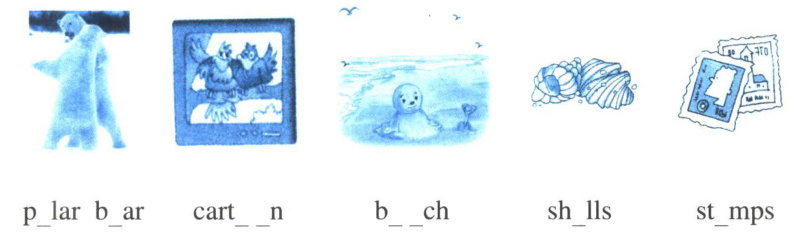 【解析】:第一幅图是北极熊,对应的单词是"polar bear",所以空缺处填"o"和"e";第二幅图是卡通画,单词是"cartoon",空缺处填"o"和"o";第三幅图是海滩场景,单词是"beach",空缺处填"e"和"a";第四幅图是贝壳,单词是"shells",空缺处填"e";第五幅图是邮票,单词是"stamps",空缺处填"a"。
