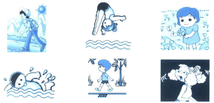 【解析】:第一幅图中一个男孩背着包在有山的路上行走,对应“E.He runs up the hill.”(他跑上山坡);第二幅图是一个女孩跳入水中,对应“B.She jumps in the water.”(她跳入水中);第三幅图一个女孩拿着网,旁边有蝴蝶,对应“C.She wants to catch a butterfly.”(她想捉蝴蝶);第四幅图一个男孩在水里游泳,对应“D.He swims across the lake.”(他游过湖);第五幅图一个男孩在街上走,对应“A.He walks through the street.”(他穿过街道);第六幅图一个人在四处看,对应“F.She looks around.”(她环顾四周)。