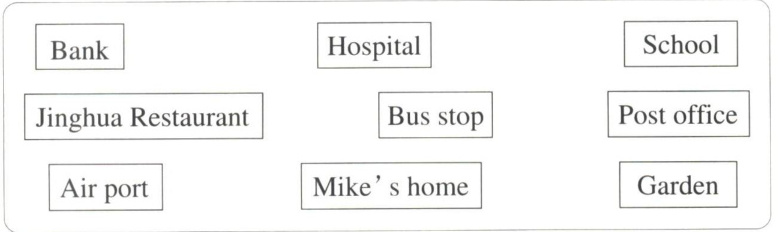 【答案】:Post office$\underline{ \quad\quad}$Hospital$\underline{ \quad\quad}$Jinghua Restaurant$\underline{ \quad\quad}$Bus stop$\underline{ \quad\quad}$Mike's home
