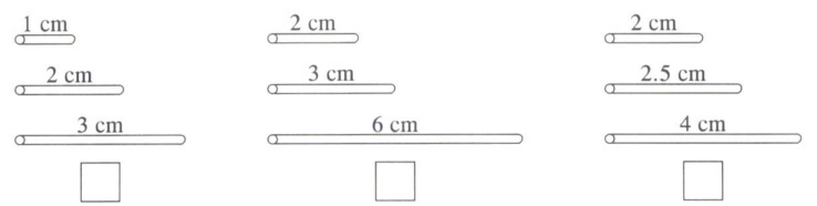 第一组小棒:长度分别为1cm、2cm、3cm。