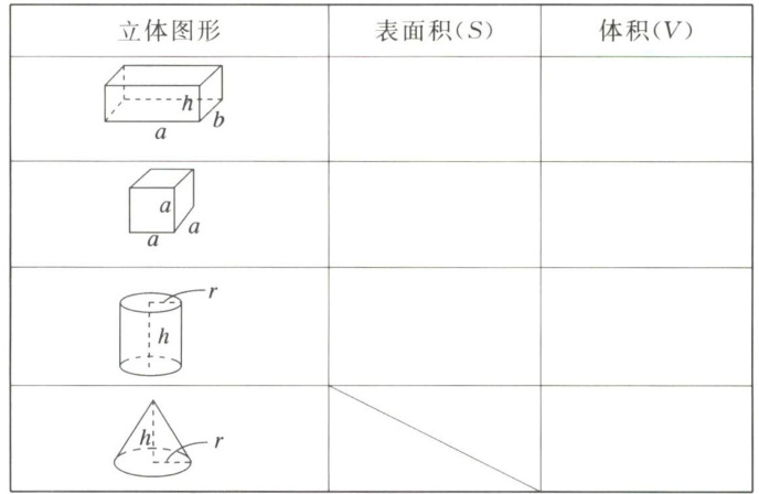【解析】:长方体的表面积公式为$2(ab + ah + bh)$,体积公式为$abh$;正方体的表面积公式为$6a^{2}$,体积公式为$a^{3}$;圆柱的表面积公式为$2\pi r^{2}+2\pi rh$,体积公式为$\pi r^{2}h$;圆锥的体积公式为$\frac{1}{3}\pi r^{2}h$,其表面积公式通常指侧面积与底面积之和,即$\pi rl+\pi r^{2}$(其中$l$为母线长),但题目中未给出母线长相关信息,根据所给表格结构及常见考查内容,此处圆锥表面积栏按常规公式填写。
