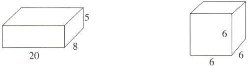【答案】:长方体的体积是$800$立方厘米,表面积是$600$平方厘米;正方体的体积是$216$立方厘米,表面积是$216$平方厘米。