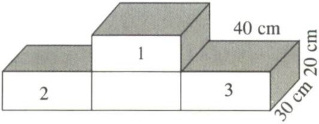 【解析】:(1)由图可知,每个长方体木块的长为30cm,宽为20cm,高为40cm。领奖台前后两面涂上白色油漆,从前面看,能看到的面有:中间长方体前面一个完整的面,左边长方体前面一个完整的面,右边长方体前面一个完整的面,共3个面;后面与前面完全相同,也是3个面。每个面的面积为长×高,即30×40=1200cm²。所以涂油漆部分的总面积为(3×1200)×2=7200cm²。