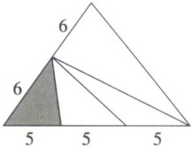 则阴影部分面积与整个图形面积的比为:$\frac{\frac{1}{2}×5× h}{\frac{1}{2}×15× h}=\frac{5}{15}=\frac{1}{3}$。