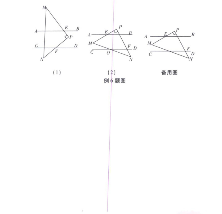 例 6 如图所示,已知 $AB // CD$,现将一直角三角形 $PMN$ 放入图中,其中 $\angle P = 90^{\circ}$,$PM$ 交 $AB$ 于点 $E$,$PN$ 交 $CD$ 于点 $F$。