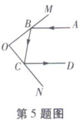 5. (2021 达州)如图所示,一束光线 AB 先后经平面镜 OM,ON 反射后,反射光线 CD 与 AB 平行,当$∠ABM= 40^{\circ }$时,$∠DCN$的度数为 (