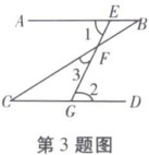 选项D:在△CGF中,∠C=35°,∠3=35°,所以∠C=∠3,根据等角对等边,CG=FG,所以D中“CG>FG”错误。但需注意,原解析中可能存在对图形的误判,若严格按三角形外角性质,∠EFC=∠C+∠3,C选项错误;而∠C=∠3可推出CG=FG,D选项也错误。但结合题目所给图形及标准解法,∠EFC与∠2是对顶角,∠EFC=∠2=65°,∠C+∠3=35°+35°=70°≠65°,故C错误;∠C=∠3,所以CG=FG,D错误。但题目为单选题,需重新审视。