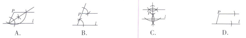 4. (2020 衢州)过直线 l 外一点 P 作直线 l 的平行线,下列尺规作图中错误的是 (