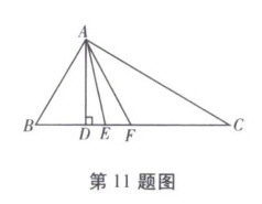 11. 如图所示,在 $ \triangle A B C $ 中 $ A D $,$ A E $,$ A F $ 分别为 $ \triangle A B C $ 的高、角平分线和中线,已知 $ \triangle A F C $ 的面积为 10,$ A D = 4 $,$ \angle D A E = 20 ^ { \circ } $,$ \angle C = 30 ^ { \circ } $。