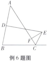 例6 如图所示,在$△ABC$中,$D是AB$的中点,$DE⊥AB$,$∠ACE + ∠BCE = 180^{\circ}$,$EF⊥AC交AC于点F$,$AC = 12$,$BC = 8$,求$AF$的长。