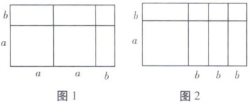 观察图2,水平方向上,小矩形的边长分别为b、b、b,所以矩形的长为 $b + b + b = 3b$;垂直方向上,小矩形的边长为a和b,所以矩形的宽为 $a + b$。因此,矩形的长为 $a + 3b$(水平方向总长度为宽方向的a加上长方向的3b,这里需注意方向,通常水平为长,垂直为宽,所以长是 $a + 3b$,宽是 $a + b$)。