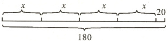 2.观察第二条线段图可知,一条线段被分成四段,每段长度都为$x$,最后一段再加上20,总长度为180。根据线段图,可以列出方程:$4x+20=180$。