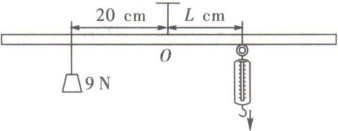 24. 小明设计了杠杆平衡实验:如图,取一根长 70 cm 质地均匀的木杆,用细绳绑在木杆的中点$O$处并将其吊起来,在左侧距离中点$O$ 20 cm 处挂一个重 9 N 的物体,为了保持木杆水平(动力$×动力臂= 阻力×$阻力臂),在中点$O$右侧用一个弹簧测力计竖直向下拉,改变弹簧测力计与中点$O的距离L$(单位:cm),看弹簧测力计的示数$F$(单位:N)有什么变化,小明在做此活动时,得到下表的数据。