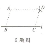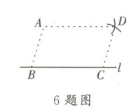 6. 如图,点$A是直线l$外一点,在$l上取两点B$,$C$,分别以$A$,$C$为圆心,$BC$,$AB$的长为半径画弧,两弧交于点$D$,分别连结$AB$,$AD$,$CD$,则四边形$ABCD$是平行四边形,理由是____