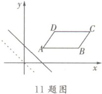 11. 如图,在平面直角坐标系中,$□ ABCD$ 点 $A$ 的坐标 $(3,2)$,点 $C$ 的坐标 $(7,4)$,直线 $y = -x$ 以每秒 $1$ 个单位长度的速度向右平移,经过______秒该直线可将平行四边形 $ABCD$ 的面积平分.
