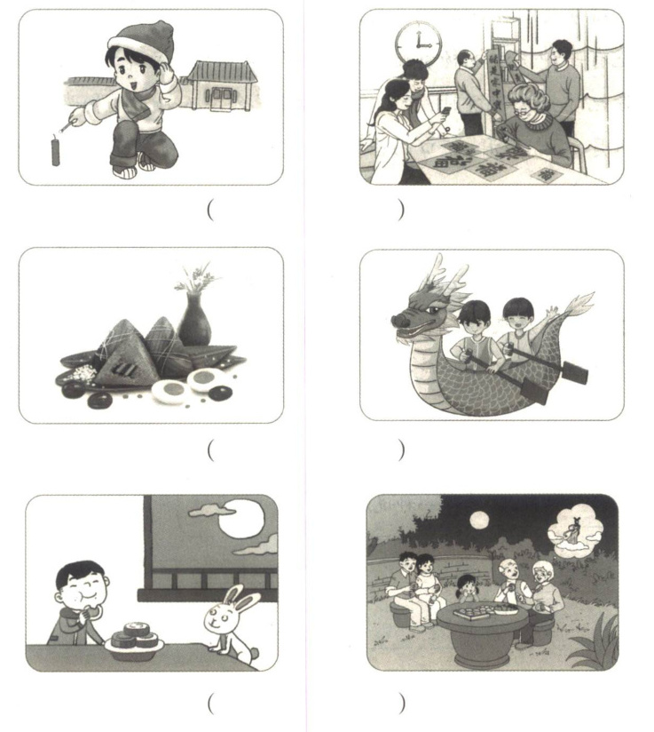 【解析】:第一幅图中孩子在放鞭炮,这是春节的典型习俗;第二幅图人们在贴春联,贴春联是春节的重要活动;第三幅图有粽子,粽子是端午节的特色食物;第四幅图是赛龙舟,赛龙舟是端午节的传统项目;第五幅图有月亮、兔子和月饼,这些都是中秋节的元素;第六幅图一家人在月下团聚,还有嫦娥奔月的图案,也与中秋节相关。对于喜欢的节日及习俗,以春节为例,春节有贴春联、放鞭炮、吃年夜饭、拜年等习俗,这些习俗承载着人们对新年的美好期盼。